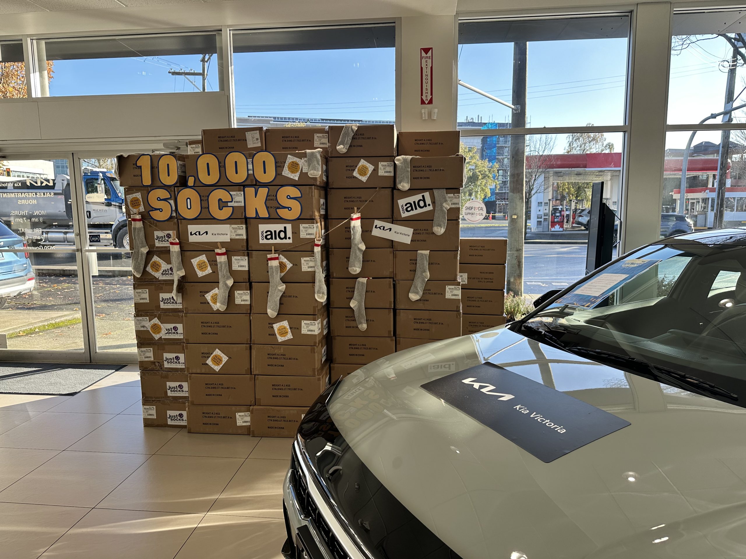 Inside Kia Victoria’s showroom, where 10,000 pairs of socks are stacked and ready for delivery through the Cool Aid Society partnership—each $1 donation buys a pair, and Kia Victoria doubles every contribution.